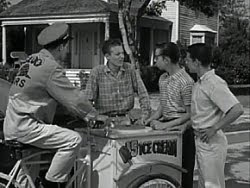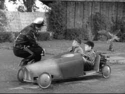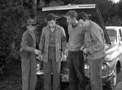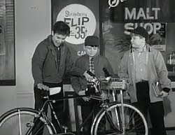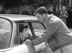 168. "Wally's Chauffeur" (December 23, 1961) -- It's another social disaster for a member of the Cleaver clan when Wally learns that he's going to be driven to a school dance by--brace yourself--a girl!! The horror of it! By episode's end, though, Wallace realizes that his fears were unjustified. But I'm wondering what Ward would have thought about all those kids piling into the girl's car at the end of the show on their way to the malt shop (right in front of a policeman, no less!)? You see, earlier in the episode, Ward had objected to Wally travelling in a similarly-packed vehicle. .... POLICEMAN: "How 'bout those illegal pipes? Have you been meaning to get those fixed, too?" LUMPY: "Well, you see, I just borrowed it for the evening. It's my father's car." POLICEMAN: "Oh, sure."