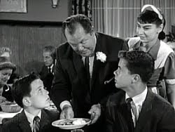 196. "Wally's Dinner Date" (September 27, 1962) -- This is an episode I find myself watching over and over again. I just love it. Wally discovers that he's a little short in the cash department after agreeing to take Julie Foster to a fancy restaurant for dinner. (Julie is played by the very cute Cheryl Holdridge, who also played the part of another one of Wally's female interests earlier in the series, Gloria Cusick.) The price of a bowl of soup at "The White Fox" (80 cents) has Wally practically hitting the ceiling. Luckily, though, Wally has a very understanding dad, who is willing to advance Wally fifteen dollars. .... EDDIE: "No girl in the world is going to settle for a liquid diet."