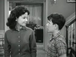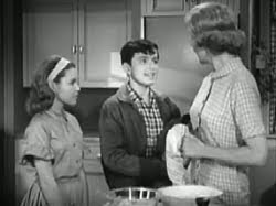 164. "Wally's Big Date" (November 25, 1961) -- Good ol' Eddie Haskell strikes again. This time, Edward decides to stab his best friend in the back by slickly arranging a swap of blind dates with Wally. The girl Wally acquires in the trade, Gail Preston, "must be at least nine feet tall" (to use Wally's verbiage from this episode). .... As a side note, I wonder if Ken Osmond (Eddie) still has that strange-looking sweater/shirt with the "V" shape down the front of it that we see him wearing in this episode and several others? It looks like the kind of garment that you might see Captain Kirk wearing on Star Trek. :) .... JUNE: "Ward, Wally's pretty angry. You don't suppose he'll go up there and hurt Eddie, do you?" WARD: "I don't know. I think I'll wait about half-an-hour, then go up and check."