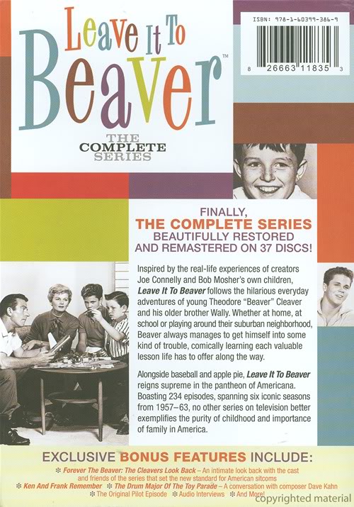 On June 29, 2010, a very pleasant thing happened -- something that many people probably didn't think would ever happen in their lifetime -- Shout! Factory released to the public "LEAVE IT TO BEAVER: THE COMPLETE SERIES", a spectacular 37-Disc DVD collection that includes all 234 episodes of what I consider to be one of the best and most rewatchable television series of all-time.