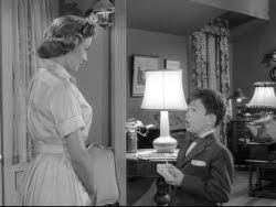 205. "Wally's Car Accident" (November 29, 1962) -- Wally borrows his father's new car and a headlight gets broken (with a little help from Eddie Haskell). .... I noticed a different license plate number on Ward's Plymouth Fury in this episode -- HBC-743. But in the opening credits, the number on the car's license plate is WJG 865. .... WALLY: "That chicken salad was pretty good. It didn't have as many bones in it as usual."