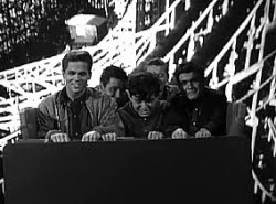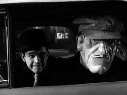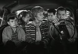 168. "Wally's Chauffeur" (December 23, 1961) -- It's another social disaster for a member of the Cleaver clan when Wally learns that he's going to be driven to a school dance by--brace yourself--a girl!! The horror of it! By episode's end, though, Wallace realizes that his fears were unjustified. But I'm wondering what Ward would have thought about all those kids piling into the girl's car at the end of the show on their way to the malt shop (right in front of a policeman, no less!)? You see, earlier in the episode, Ward had objected to Wally travelling in a similarly-packed vehicle. .... POLICEMAN: "How 'bout those illegal pipes? Have you been meaning to get those fixed, too?" LUMPY: "Well, you see, I just borrowed it for the evening. It's my father's car." POLICEMAN: "Oh, sure."